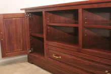 This cabinet was designed for a large HDTV and uses red oak, poplar, and birch plywood. Finish is Olympic Merlot stain and Minwax satin clear polyurethane.