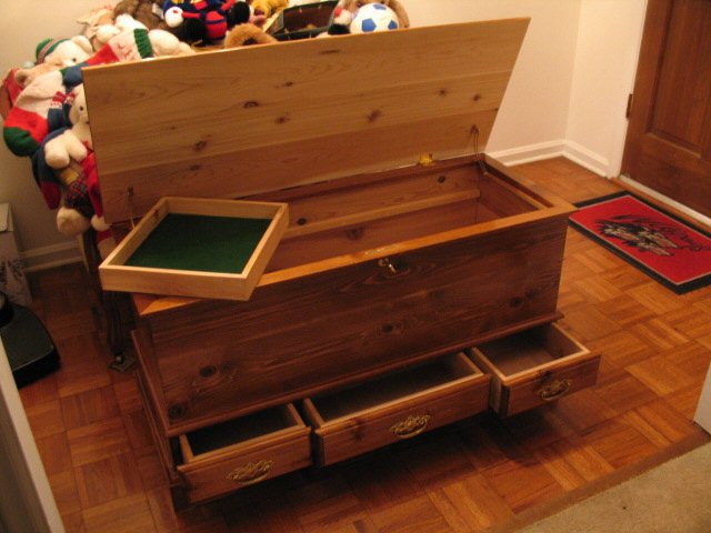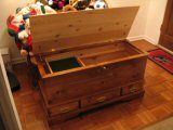 This country-style hope chest is all cedar and finished in Dark Walnut Danish Oil and polyurethane. Note the drawers and the pullout tray.