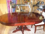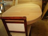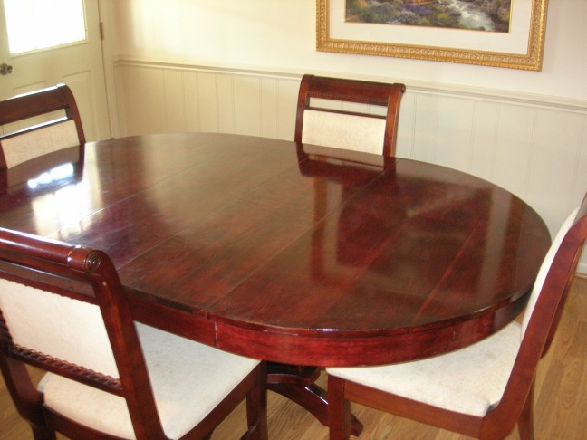 This oval extension table is constructed of cherry and is finished with Minwax Polyshades Bombay Mohagany and has two extension leaves (shown inserted in the photos).