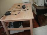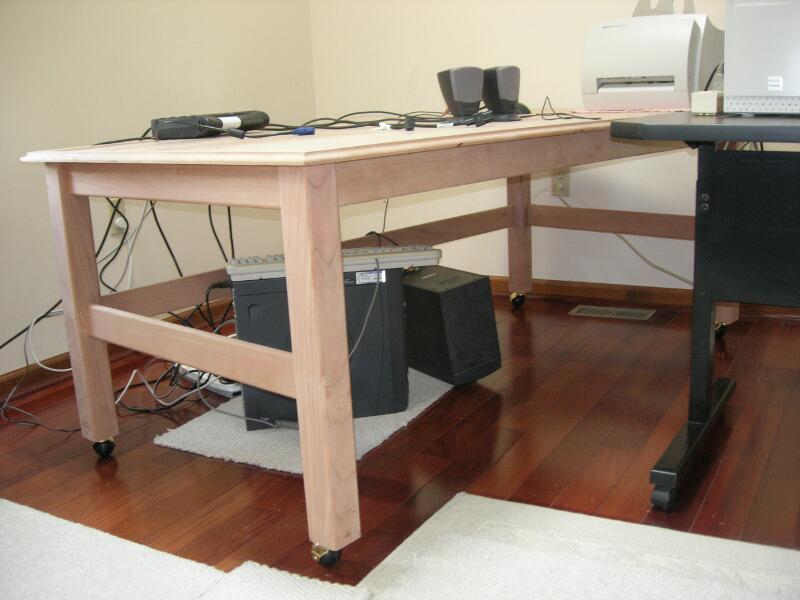This work table is constructed of solid cherry and is unfinished to allow the cherry to naturally darken with time. The table is on castors for easy movement. Dimensions: 6' W x 3' D x 28" H.