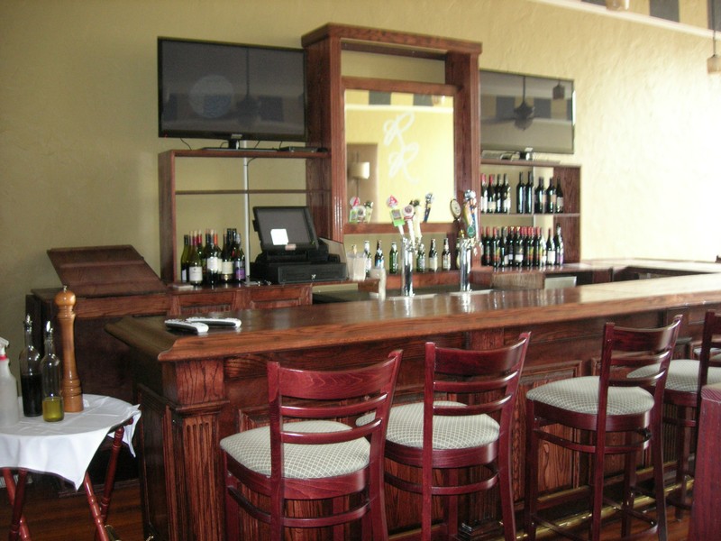 This solid oak bar measures 16' x 8', has brass footrails and traditional moulding, is stained in Minwax Red Mahogany with polyurethane on the the sides and Helmsman Spar Varnish on the bar tops. This bar was built for an upscale restaurant in Waxhaw, NC.