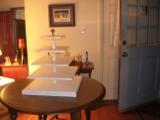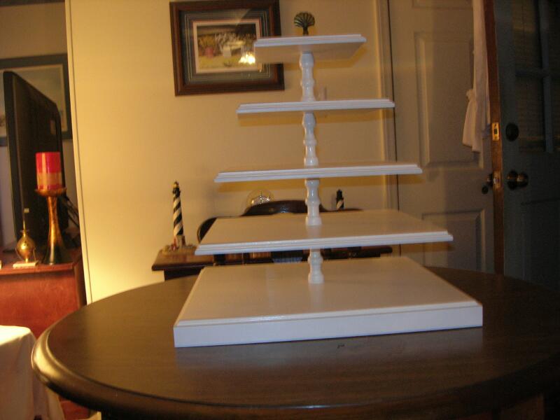 These cupcake/muffin display towers are constructed of poplar. The shelves sit atop a lazy susan that allows 360 degree rotation. Painted with Valspar White. Base dimensions: 20" x 20". Disassembles for easy transport.