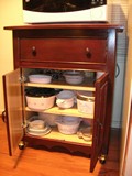 This cabinet was built of poplar and stained with Minwax Antique Red stain, with a polyurethane top coat. The drawer extends 20", making full use of the extra depth of the cabinet needed to seat the microwave. Dimensions: 36" H x 30" W x 22" D.