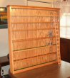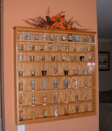 This large (3'x3'!) shot glass shelf is built from red oak and has a natural finish. For the shotglasses, it has felt covering on the shelves, and removable inserts that hold 14 regular shotglasses.
